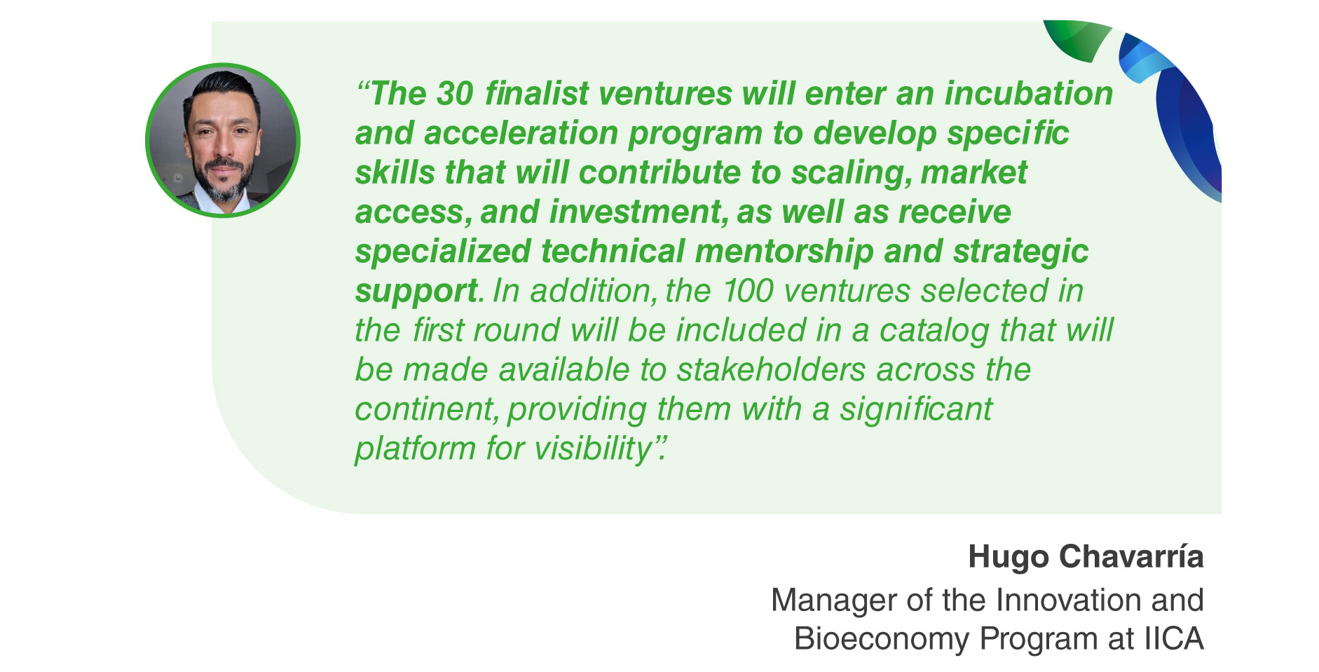 Hugo Chavarría, Manager of the Innovation and Bioeconomy Program at IICA, explained that the competition served as a mechanism to identify existing agricultural bioenterprises across the continent and contribute to their growth. In that regard, he reported: