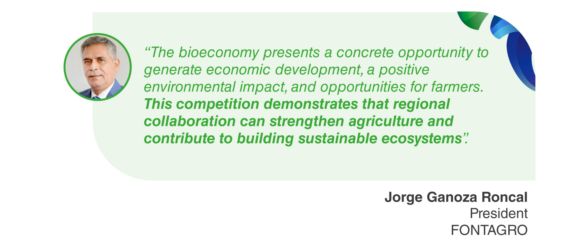 Jorge Ganoza, President of FONTAGRO and Executive President of the National Institute of Agricultural Innovation (INIA – Peru), highlighted the extraordinary response of bioeconomy entrepreneurs in the region and affirmed that it demonstrates the great creativity and talent that exists among agricultural innovators.