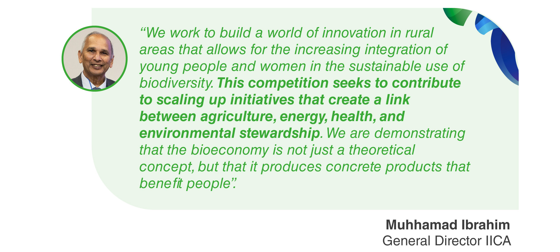 Muhammad Ibrahim, Director General of IICA, highlighted the importance that the promotion of agricultural bio-entrepreneurs assumes for IICA::