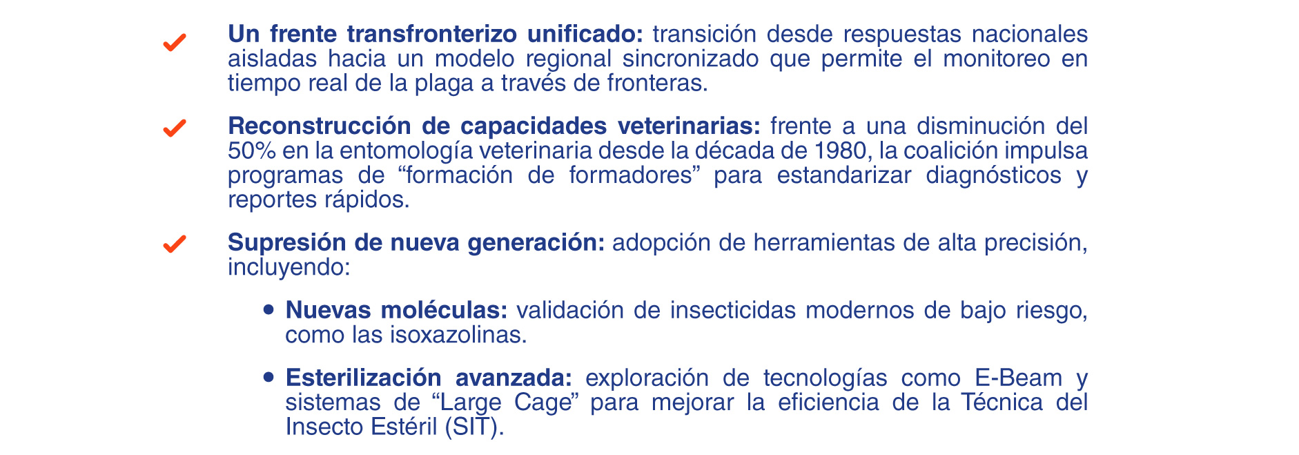 En estrecha colaboración con el IICA y socios estratégicos de Estados Unidos, FONTAGRO está impulsando inversiones estratégicas en investigación y desarrollo que movilizan financiamiento compartido y articulan recursos públicos y privados para acelerar la innovación en las Américas. Su Consejo Directivo ha reservado fondos para dos nuevas iniciativas regionales orientadas al Gusano Barrenador del Nuevo Mundo y al enverdecimiento de los cítricos (HLB), con convocatorias próximas destinadas a apoyar consorcios multinacionales de investigación y desarrollo tecnológico que integren universidades estadounidenses, institutos nacionales de investigación y actores del sector privado. Estas inversiones coordinadas buscan generar soluciones prácticas y escalables, al tiempo que fortalecen la cooperación científica hemisférica y la resiliencia agropecuaria a largo plazo.