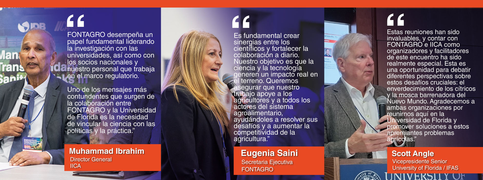 Durante la sesión inaugural, el presidente de FONTAGRO, Jorge Ganoza Roncal; el director general del IICA, Muhammad Ibrahim; y el vicepresidente senior de Agricultura y Recursos Naturales de la Universidad de Florida, J. Scott Angle, destacaron la urgencia de reforzar la coordinación y las sinergias entre institutos de investigación, autoridades sanitarias nacionales y actores del sector privado, con el fin de generar soluciones a corto, mediano y largo plazo. En palabras de la secretaria ejecutiva de FONTAGRO, Eugenia Saini: “A través de FONTAGRO, articulamos científicos y socios entre países para cofinanciar la investigación y alinear inversiones, de modo que el conocimiento beneficie a toda la región”.